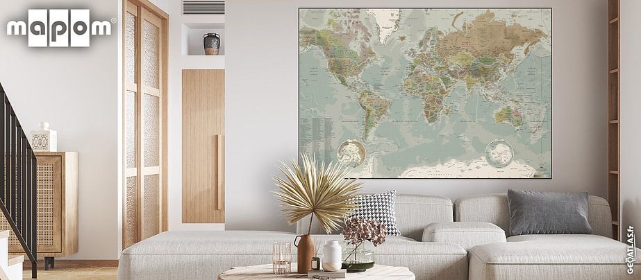 The Mapom workshop of Géoatlas is a collective of cartographers based in France. For over 30 years, these design and graphic arts enthusiasts have methodically developed the content of Géoatlas sites, creating the official maps of the Tour de France, the Paris Marathon, the Olympic Games, and more. The Mapom concept: taking the world map out of the back of the classroom, hallways, books, GPS, and more, and proudly displaying it on the most beautiful walls of the home and office. While maintaining the absolute rigor necessary for the development of a geographical map, cartographers Oliv & Oran deconstruct the classic codes of cartography by imagining, for example, a fuchsia planisphere, offbeat typographies, and more. The main thing is to preserve the main interests of a map: learning and traveling!