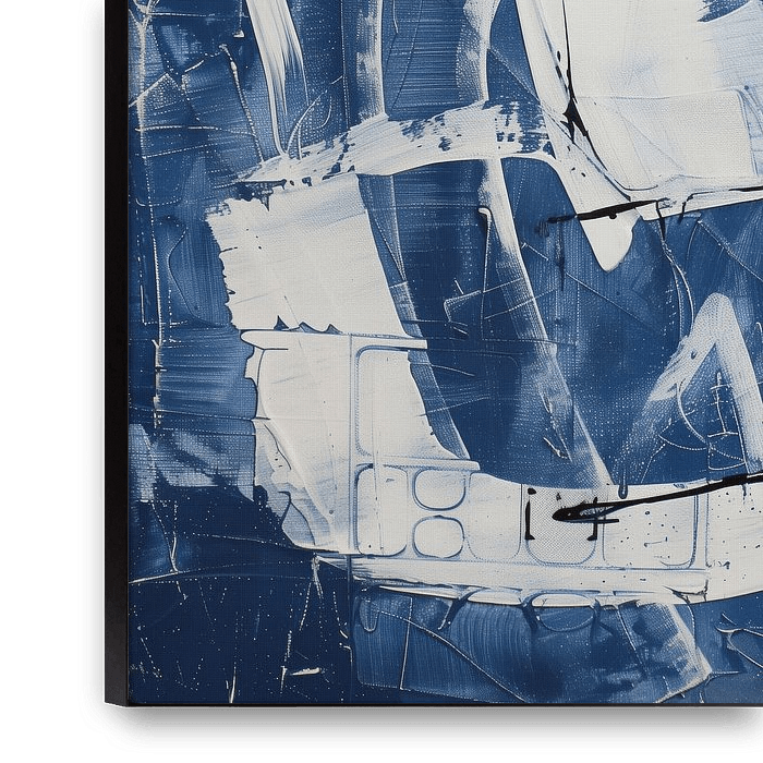 A dynamic composition featuring bold white and black brushstrokes set against a deep blue background. Abstract shapes and lines create a sense of movement and tension, with textured layers adding depth and intrigue.