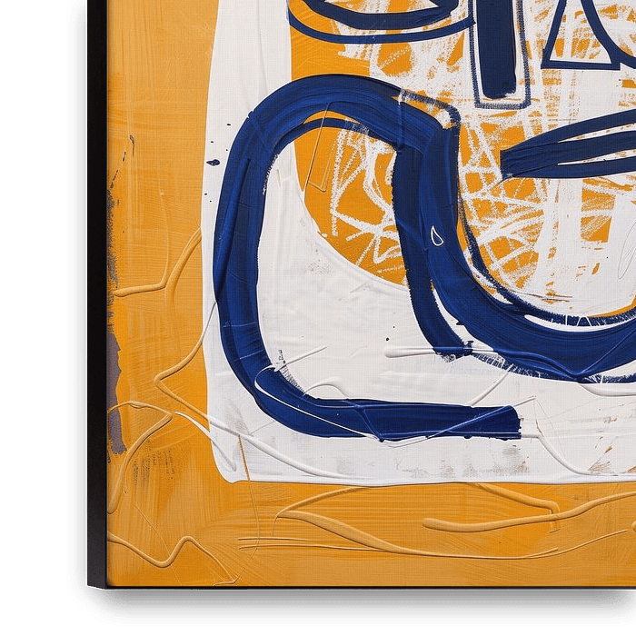 Bold blue lines and a mix of geometric shapes create an abstract composition against an orange background. White and black accents contribute to the layered and dynamic visual impact.