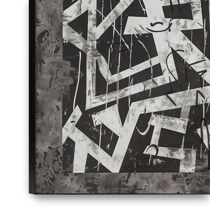 A chaotic arrangement of white geometric shapes and black scribbles is layered over a dark background, creating a bold, abstract composition. The edges are framed with a textured, grayish border that adds depth to the overall design.