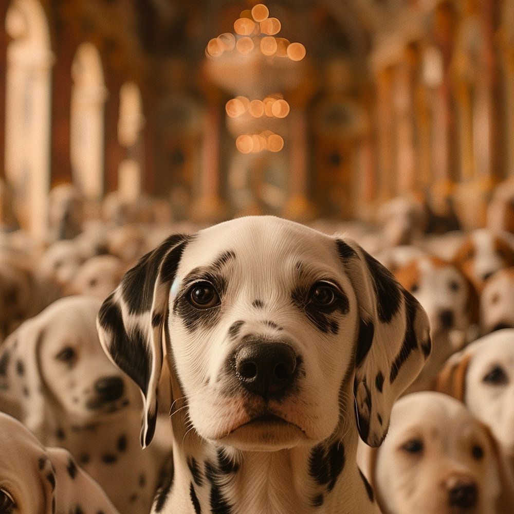 101 dalmatians in a palace. In this picture, you can see these white dogs with black dots. Beautiful dog eyes look at you from this royal space.