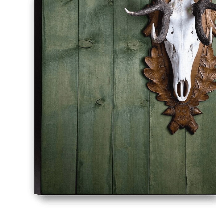 Hunting trophy, deer antlers on a wooden board hung on a green wooden wall