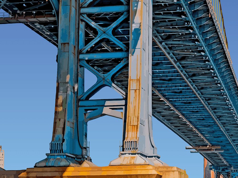 A clear blue summer sky without a single cloud forms the background of this intriguing digital artwork. The sun is high and casts sharp shadows, adding emphasis to every detail of the composition. At the centre of the image, the iconic Manhattan Bridge dominates, with its distinctive metal structure and sturdy stone uprights. Stretching from left to right, the bridge leads the eye across the water, where an impressive skyscraper pierces the skyline. Other buildings, ranging from modern glass to traditional brick, flank the tower, giving it an urban dynamic.