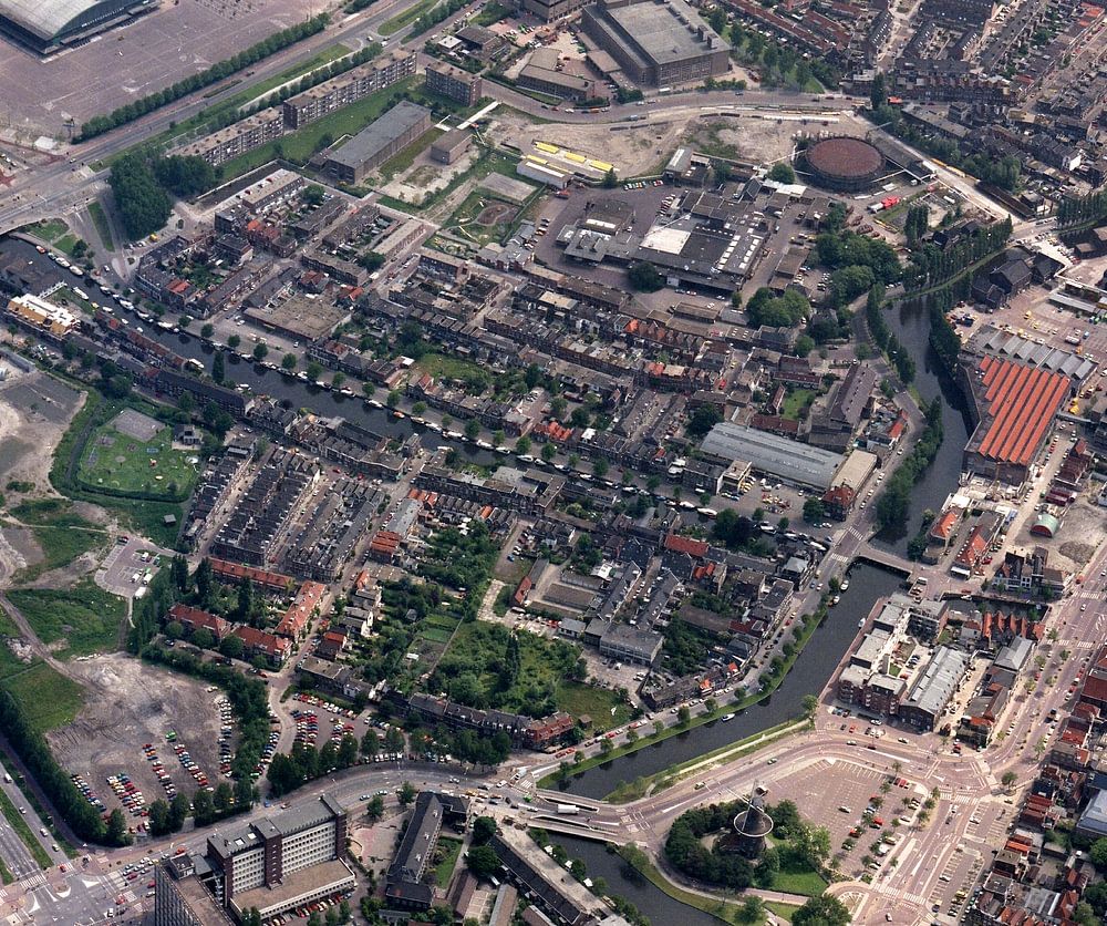 1985: Historical aerial photograph of the city of Leiden, Netherlands, showing the Stationsgebied, mill de Valk, Groenoordhallen and Central station