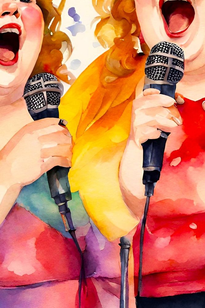 Buy this digital art artwork 2 sociable ladies sing karaoke by De gezellige Dames as a reproduction on canvas, ArtFrame, poster and wallpaper, printed on demand in high quality.