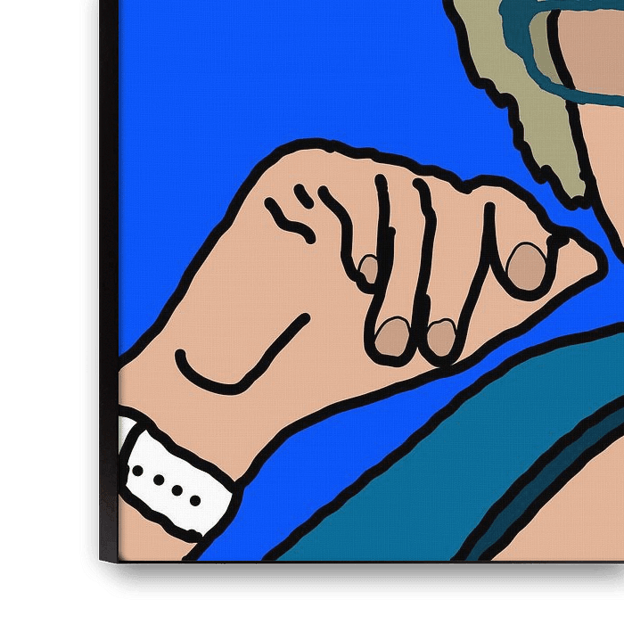 In this work, simplicity and expression meet. The hard lines and flat colours lift the woman out of reality and place her in a symbolic space, where she simultaneously becomes herself and an archetype: the voice of experience, the smile behind the glasses, the presence that reminds us that humanity is always layered and full of colour.