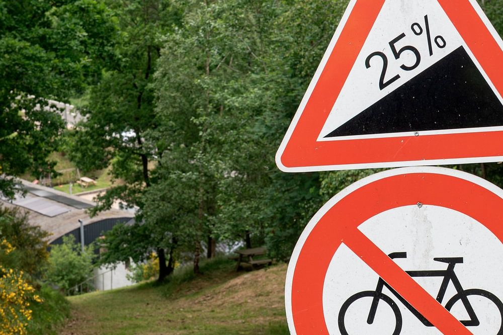 Dürler Belgium Signs showing an incline of 25% and not to cycle. One would think that the lower would be superfluous considering the steepness but with an Imbiss (snack bar) at the bottom of the hill and the Belgian love of chips one never knows. steep, hill, really, very,, funny, surprising, odd, frituur, ban, banned, cycling, bike,