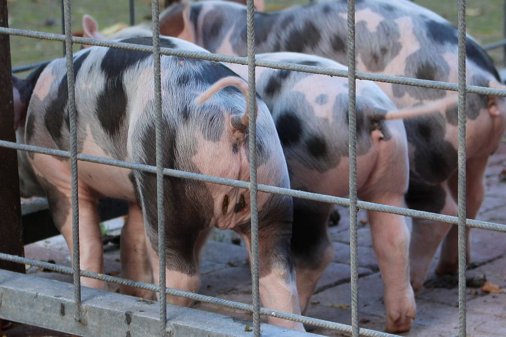 3 biggetjes op een rij in hun hok. In het Borpark van Alphen A/D Rijn.