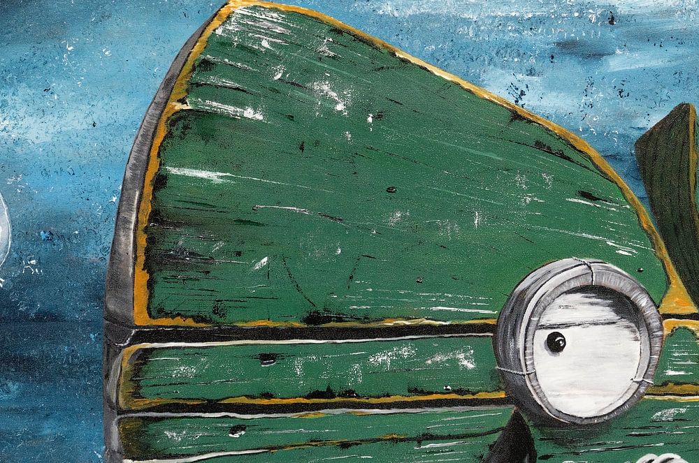 The inspiration comes from an Italian artist who makes these fish from real wood, but on a small scale (20-30 cm). This painting originally measures 120 by 80 cm.