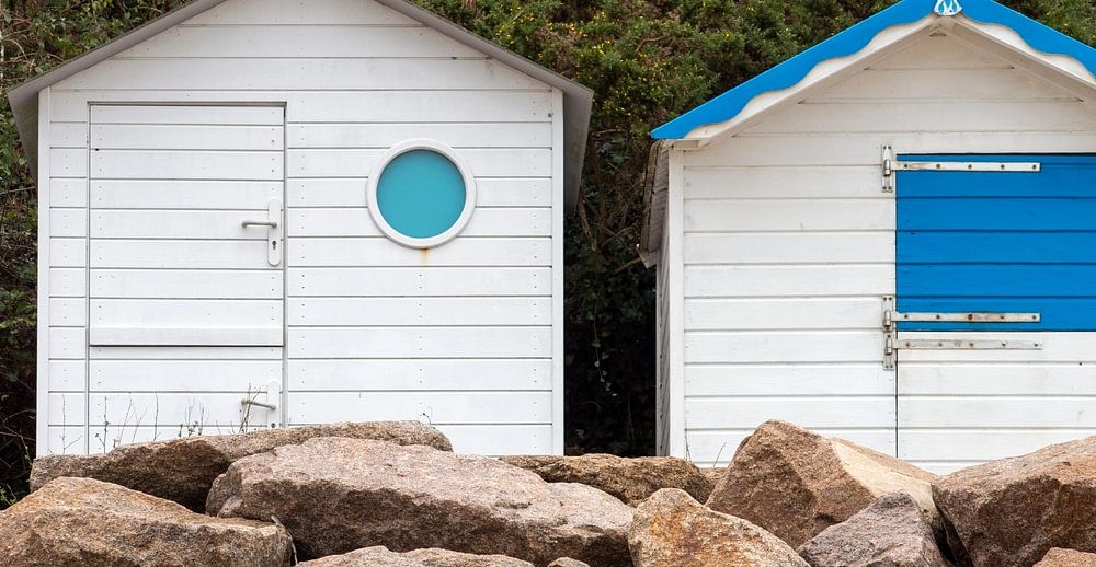 A photo of four abandoned beach huts on the beach of Barneville-Carteret in Normandy in autumn.