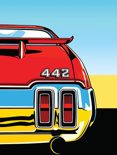 Energetic pop-art illustration of the rear of a classic 442 muscle car — oversized wing, red body, bold color blocks and retro 60s/70s vibe. High-contrast and powerful — heroic automotive art for modern walls that love horsepower and classic style.