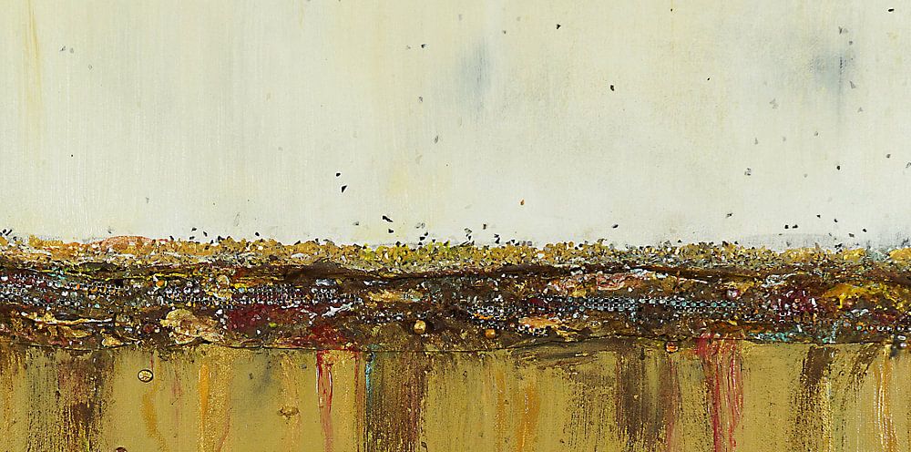 Acryl auf Leinwand mit Modelliermassen, Pigmenten, Steinen, Sand, Metallstücken, Glasresten und –perlen, Schlagmetallen, Halbedelsteinen, Spiegelsplittern, Schmuckresten, Hölzern, Gräsern, Schilfrohr, diverser Kleinkram - was sich so im Haus, ums Haus, im Wald, am Strand findet (hier: am Bodensee)