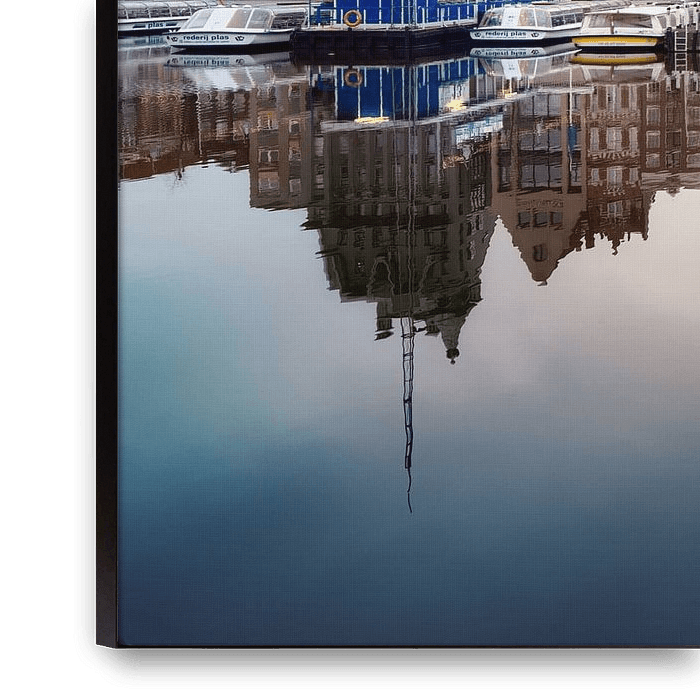 Reflection of historic buildings and canal boats on the Damrak in Amsterdam