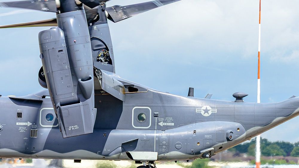 A Bell Boeing CV-22B Osprey of the U.S. Air Force leaves for its home base in England after the Royal International Air Tattoo.