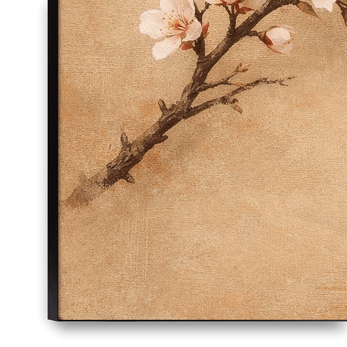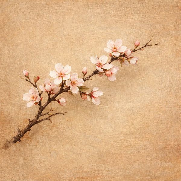 A delicate cherry blossom branch set against a warm, textured background in sandy tones. This Japandi-inspired piece combines the beauty of nature with minimalist tranquillity. The soft pink blossoms contrast subtly with the warm earth tones, creating an atmosphere of serenity and timeless elegance. Perfect for a soothing interior in…