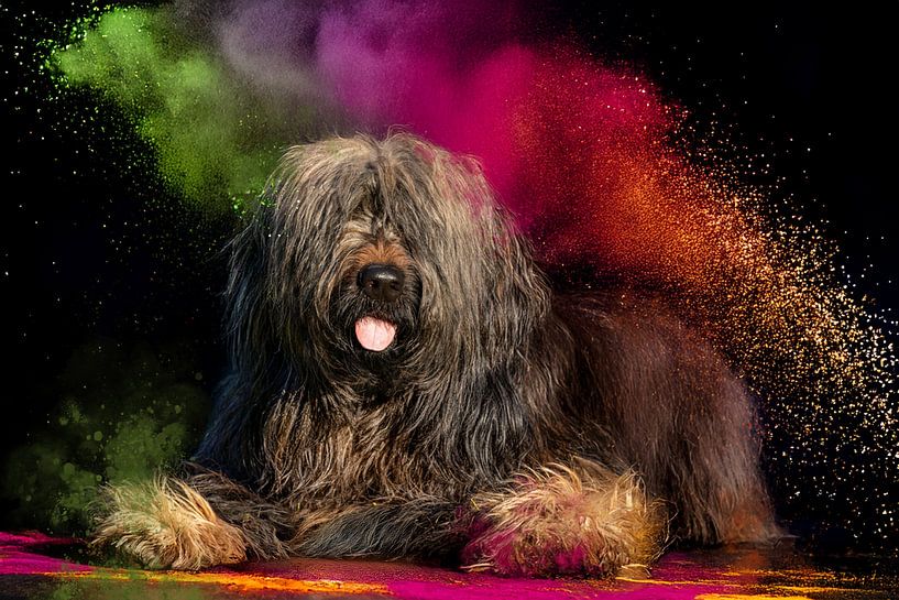 A briard lies in front of a black background with coloured powder flying around it.