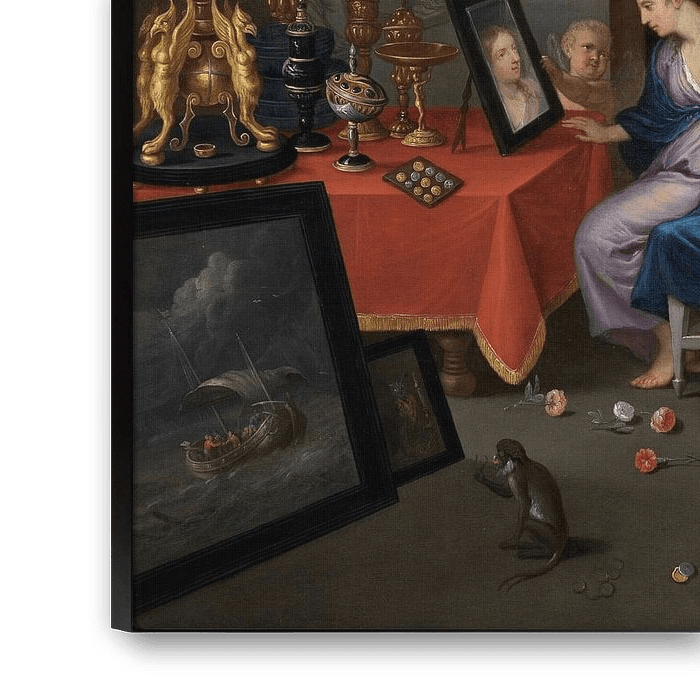 Jan van Kessel desended from a family of artists. His maternal grandfather was Jan Brueghel the Elder. It is believed that he was trained in his father's workshop and under his uncle Jan Brueghel the Younger. In 1645 he was accepted into the painters' guild of Antwerp. His extensive oeuvre, primarily studies of nature, landscapes, genre scenes and allegories, is characterized by his efforts to capture the diversity of the world and to vividly illustrate it. This interest is also reflected in our painting by van Kessel in the form of a so-called gallery picture, an image of a real or imagined collection. The figures were probably painted by Erasmus Quellinus II in a quite usual group of artists.