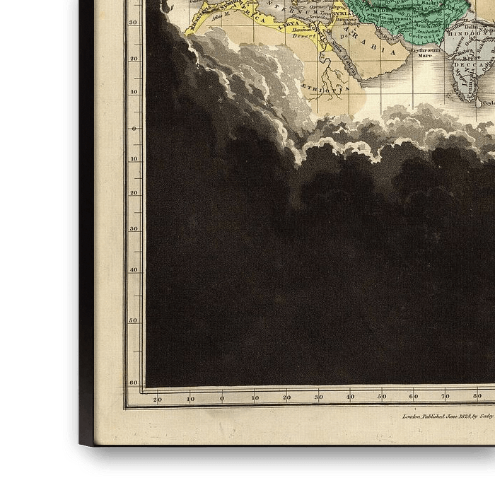 Clouds receding to show the known earth from the end of the third Punic War, 146 B.C., to the birth of Christ. (A.M. 3853 to A.M. 4004). Eighth period. In full color stretching from Ireland and Morocco to China. The Roman Empire shown in yellow, the Parthian Empire in green, Hindoostan in gray and China in light brown.