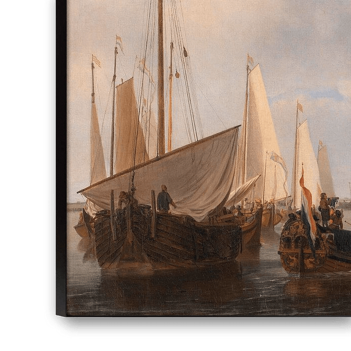 This is the largest and most elaborate of the pictures by Willem van de Velde the Younger in the National Gallery’s collection. Painted with the artist’s usual accuracy and fine detail, the depiction of a marine occasion fairly common in a seafaring nation like seventeenth-century Holland becomes spectacular and exciting. The central vessel is a Statenjacht (state yacht) flying the Dutch colours. The puff of smoke is cannon fire, a salute to the officials approaching in the barge alongside, which bears the coat of arms of Amsterdam.