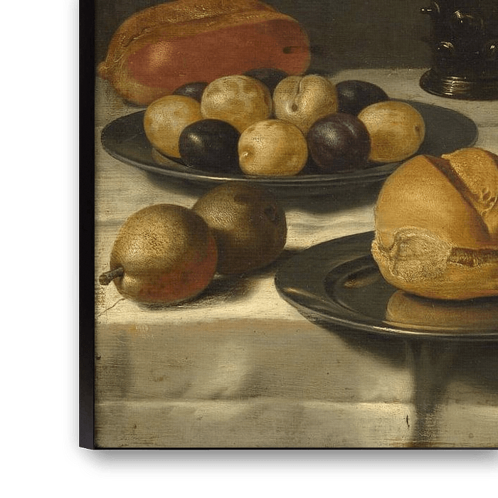 A Dutch breakfast, Floris van Schooten Floris van Schooten (Haarlem, c. 1585 - there, 1656) was a Dutch painter of the Golden Age period. He mainly produced still lifes, often so-called 'breakfasts', with an apparent preference for cheese, later also fruit, and genre pieces (kitchen scenes, market scenes). Van Schooten was a son of the Amsterdam-born wealthy Gerrit Jacobsz. van Schooten, who settled in Haarlem in 1612, possibly because the climate there was more tolerant of people with a Catholic philosophy of life. There in 1612, Floris married Rycklant Bol van Zanen, a daughter of a wealthy local brewer in Haarlem (she died in 1626). They had at least three daughters and a son, Johannes, who also went into painting. Floris was a member of the Haarlem St Luke's guild, of which he became dean in 1639. His work was influenced by the style of his fellow townsmen Pieter Claesz., Pieter Aertsen, Floris van Dyck, Roelof Koets and Willem Claesz. Heda.