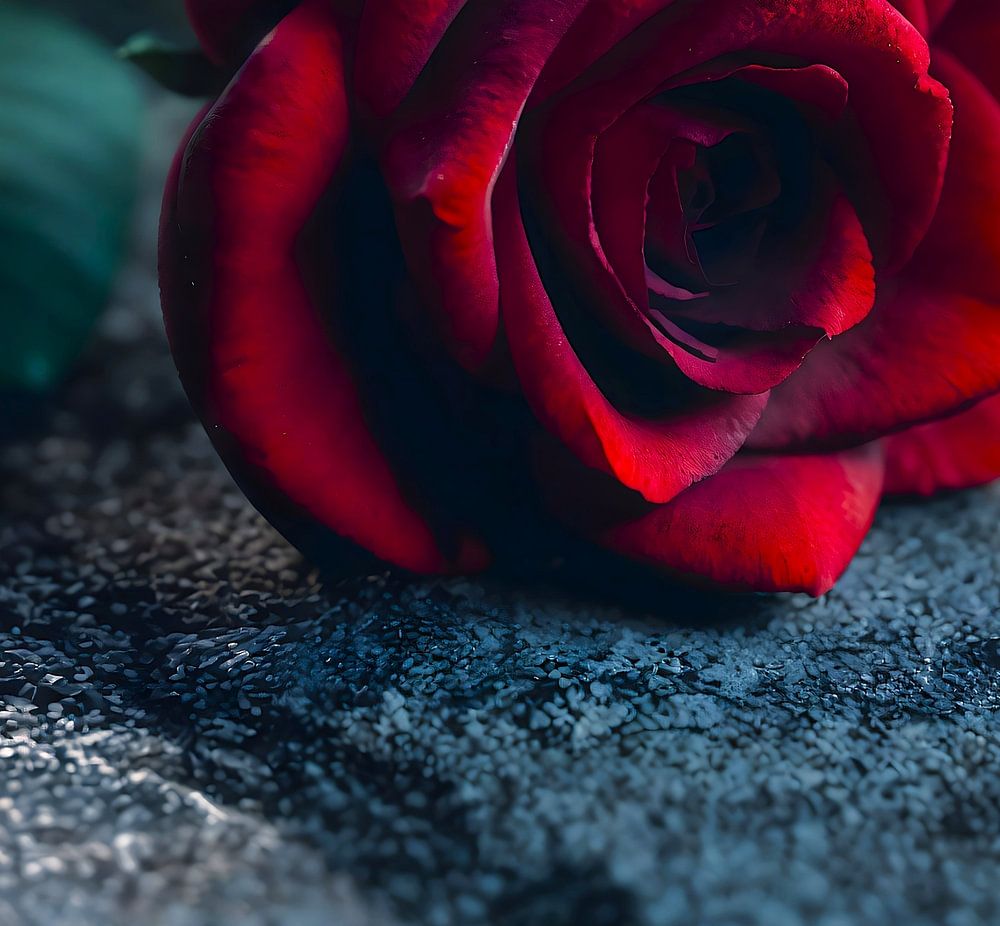 A single, deep red rose resting elegantly upon a textured, cool-toned stone surface. The dramatic lighting accentuates the rich, velvety petals and creates a poignant contrast with the rough, weathered ground. With a shallow depth of field focusing attention squarely on the bloom, this image evokes themes of romance, remembrance, beauty, and solitary reflection. It is an authentic representation suitable for various commercial applications requiring a touch of classic elegance or emotional depth.