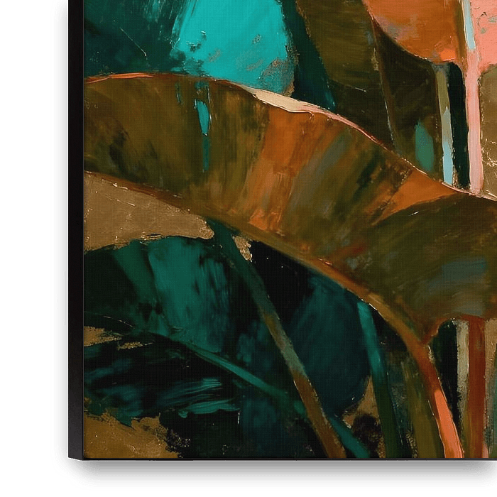 A Gentle Density is a contemplative abstract-figurative painting inspired by tropical flora, evoking a serene, luxurious atmosphere without literal depiction. The composition guides the viewer’s eye through layered textures, subtle brushwork, and gentle glazing, creating a handcrafted, museum-quality presence.