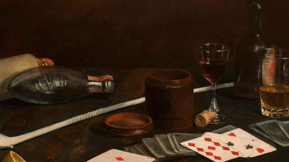 “A Gentleman’s Table” includes several bottles of alcohol and a corkscrew (with a cork still attached) to indicate that drinking is ongoing at this gathering. It is as if the table’s occupants have just stepped away for a moment and will return to finish their game and drinks. At the lower left of the painting the combination of glass, spoon, sugar cube, and lemon likely suggest the presence of absinthe, seen as a potent and potentially lethal liquor.