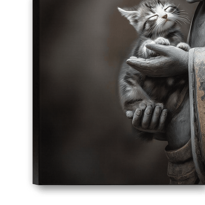 Portrait of a small Buddha with a kitten in shades of brown and grey
