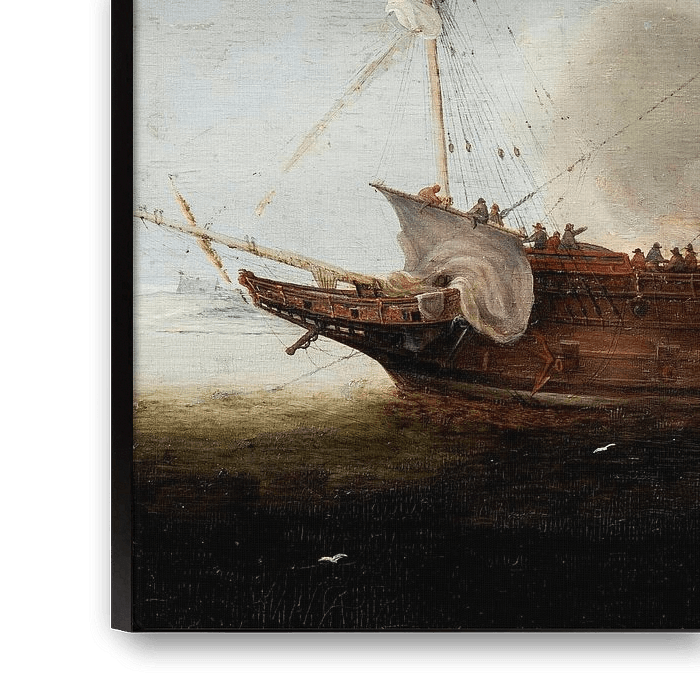 Dense smoke envelops a warship which has just fired a cannon from the starboard side. At the same time, two boats are mooring to the three-masted warship on the port side. The extensive detail that characterises the composition is an typical example of Hendrik Cornelisz Vroom’s unrivalled ability to paint marine scenes with great precision and accuracy. The artist is seen by many as one of the fathers of Dutch marine painting.