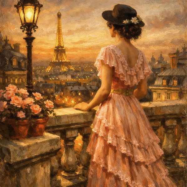 In this work, time seems to stand still for a moment. A woman looks out over Paris, bathed in warm evening light, as the city beneath her slowly lights up. The Eiffel Tower rises as a silent witness of memories and expectations, an anchor point between what has been and what may yet come.