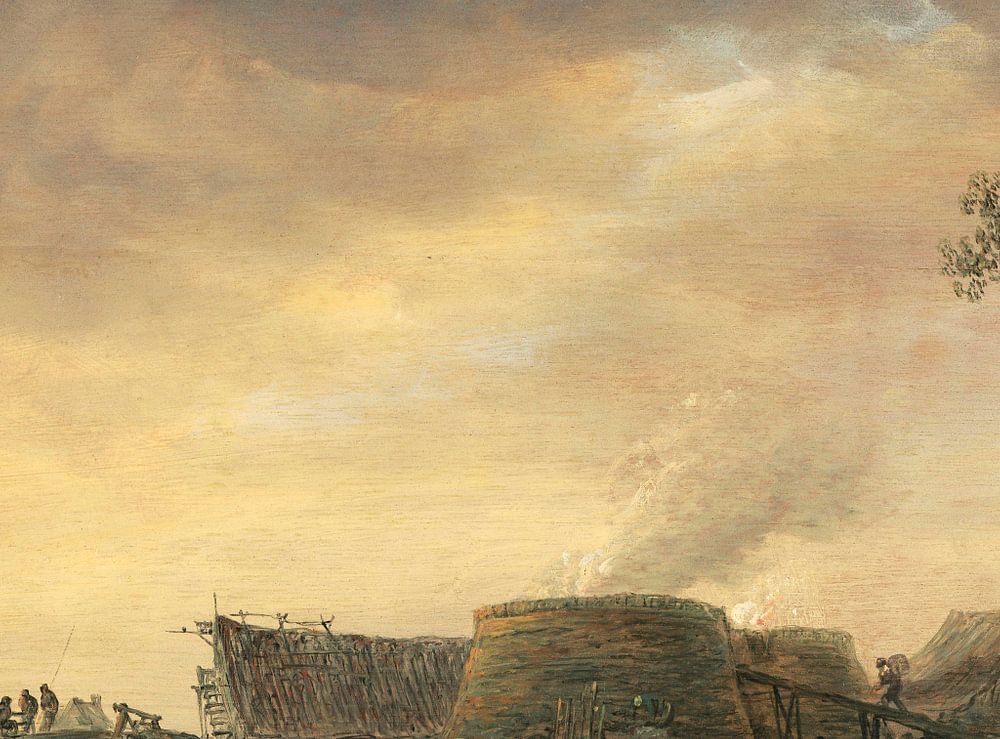 This earthen palette serves Goyen well in A River Landscape with Lime Kilns. While he was primarily a landscape painters, Goyen maintained a certain sensitivity in the rendering of the subject occupying his scenes. Here, he shows two lime kilns and their supporting structures located next to a river. A worker carries a bag of limestone up to the charging area. Tools needed for arranging limestone and charcoal in the kiln and the removal of the finished lime are seen leaning against the kiln wall. Other workers toil at a fire to the left of the kilns. The scene is completed with figures occupying the boats in the foreground.