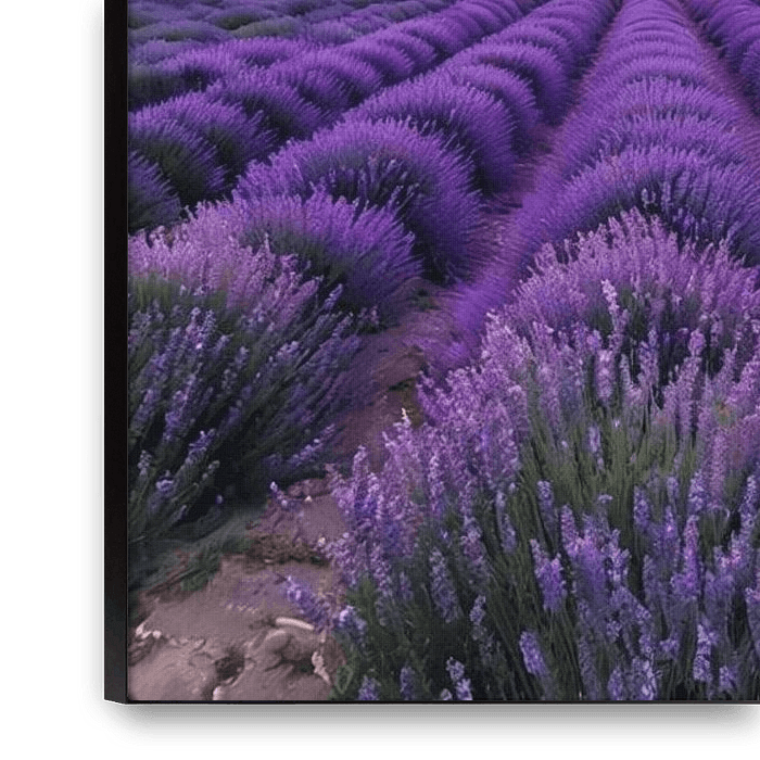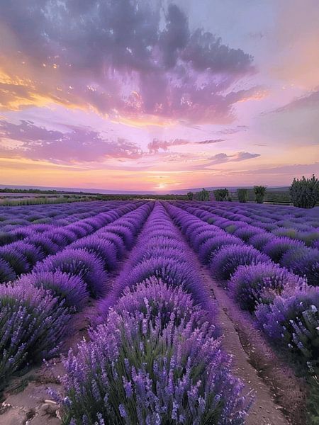 Buy this digital art artwork A Symmetrical Sunset Over Radiant Purple Lavender Fields by Artistic as a reproduction on canvas, ArtFrame, poster and wallpaper, printed on demand in high quality.