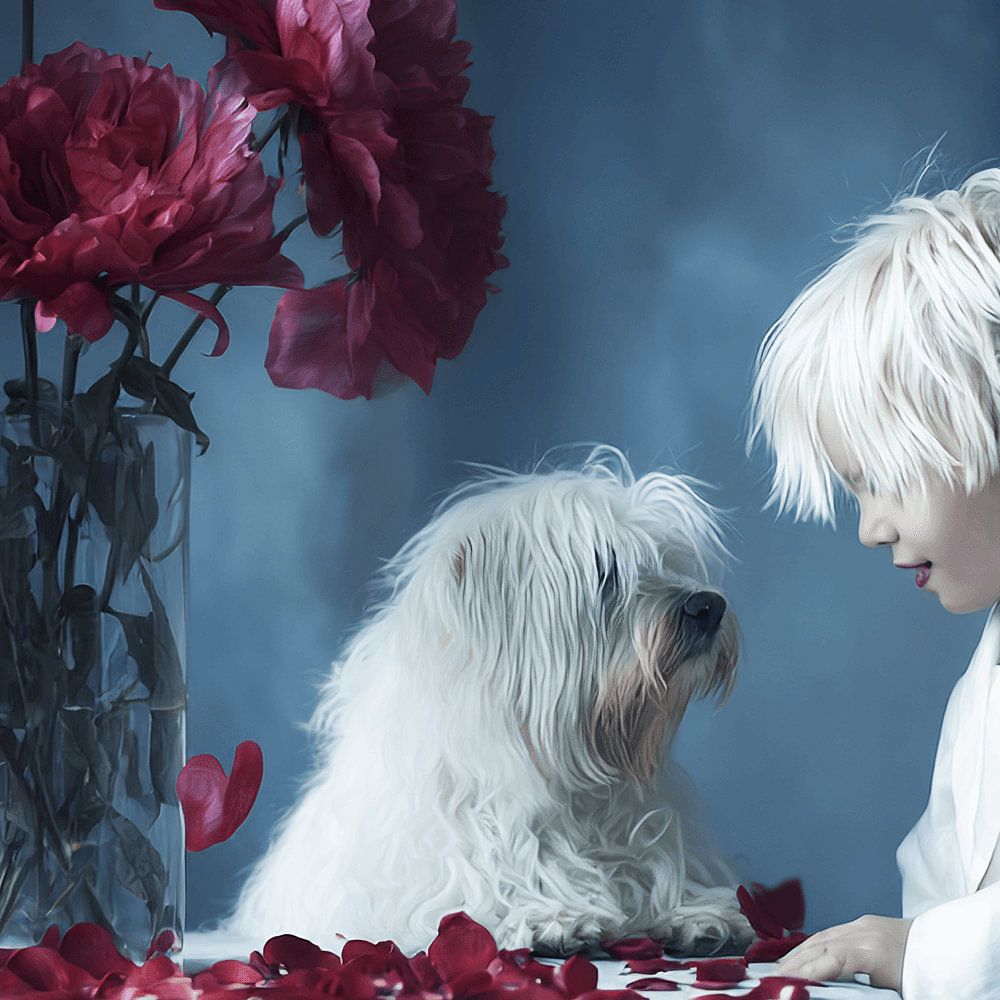 This endearing digital artwork shows a little blonde child in a white suit sitting at an elegantly set table opposite a white fluffy dog. Between them…
