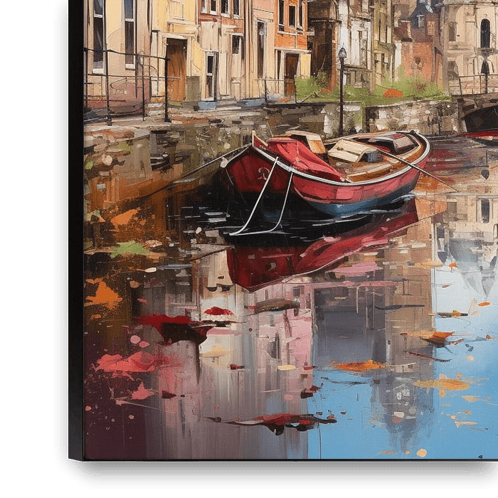 An atmospheric watercolour painting shows a quaint old Dutch staff by the water. A narrow canal winds between charming, leaning canal houses. A small bridge connects the banks. while a barge floats on the rippling water. The pastel colours create a dreamy, nostalgic atmosphere.