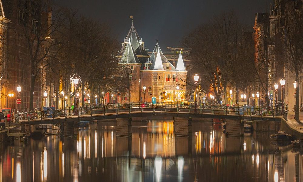 The soft glow of the lanterns on either side of the Kloveniersburgwal creates a serene glow in the dark winter night. This light serves as a subtle guide, highlighting the architectural details of the old market and lending an almost ethereal quality to the scene. Every detail, no matter how small, is imbued with a sense of timeless serenity.
