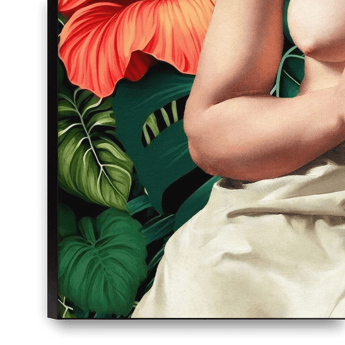 This unique artwork is a modern, botanical reinterpretation of the classic painting "Woman Braiding Her Hair" (1839) by the Danish artist Ludvig August Smith.