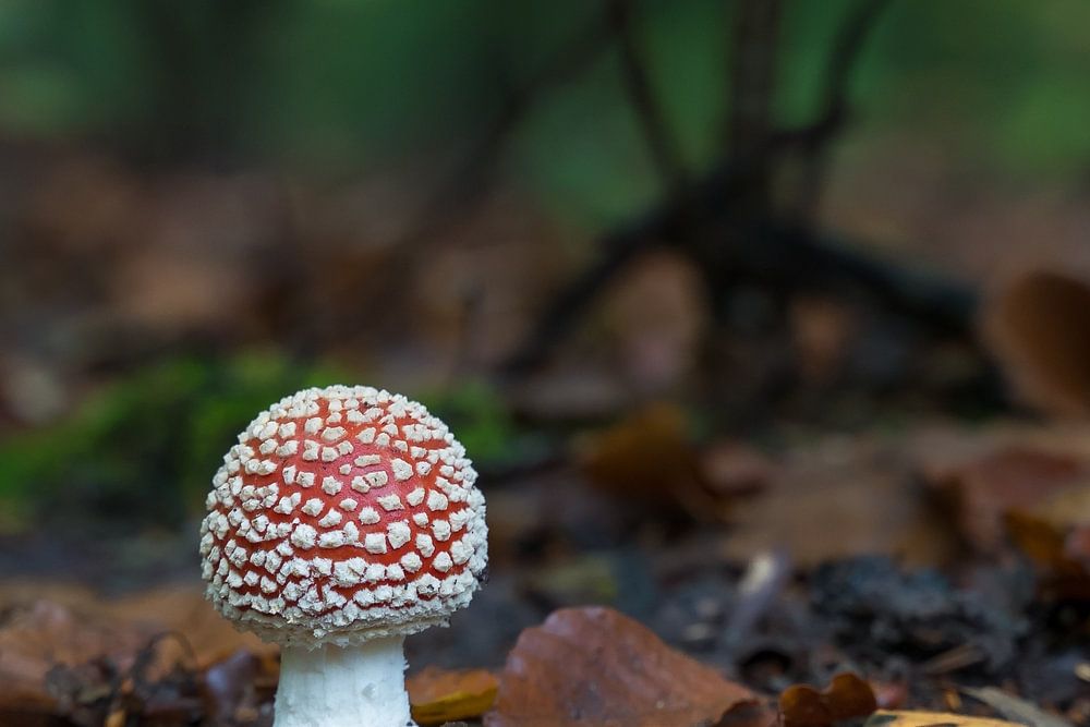 This beautiful red and white mushroom is in an atmospheric setting with beautiful brown autumn tones in the background.