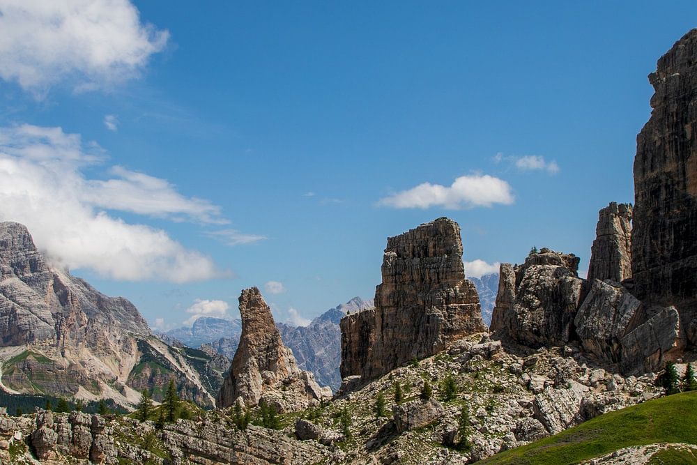 The Cinque Torri is a small mountain group in the Dolomites. The group consists of five prominent peaks and a number of smaller rocks. The highest point is formed by the 2361 meter high Torre Grande. The four other main peaks are the Seconda Torre, Terza Torre Quarta Torre and Quinta Torre.