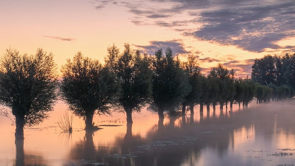 The Noordma reclassification area in the province of Drenthe, near Zuidlaren is a special nature reserve. In Noordma, the Hunze flows from Drenthe to Groningen. Via Tusschenwater, the Hunze flows into the Zuidlaardermeer. It is part of a larger project to restore the Hunze valley. Reclamation has made the area wetter, creating a unique marsh landscape that is once again ideal for all kinds of plants and animals. The area also plays an important role in water storage. This photo shows a serene sunrise in the Noordma water storage and nature reserve in Zuidlaren in the province of Drenthe. A row of characteristic pollard willows stand in the mirror-smooth water, a result of the flooded land. Sunrise envelops the sky in soft pastel colours of pink and orange, which in turn reflect beautifully in the surface of the water, creating a dreamy atmosphere. Thin wisps of fog float low over the water, adding to a mystical atmosphere. The beautiful symmetry of the trees and their reflections gives a sense of tranquillity and harmony. It is an idyllic image that captures the early morning beauty and unique wetland nature of this area of Drenthe.