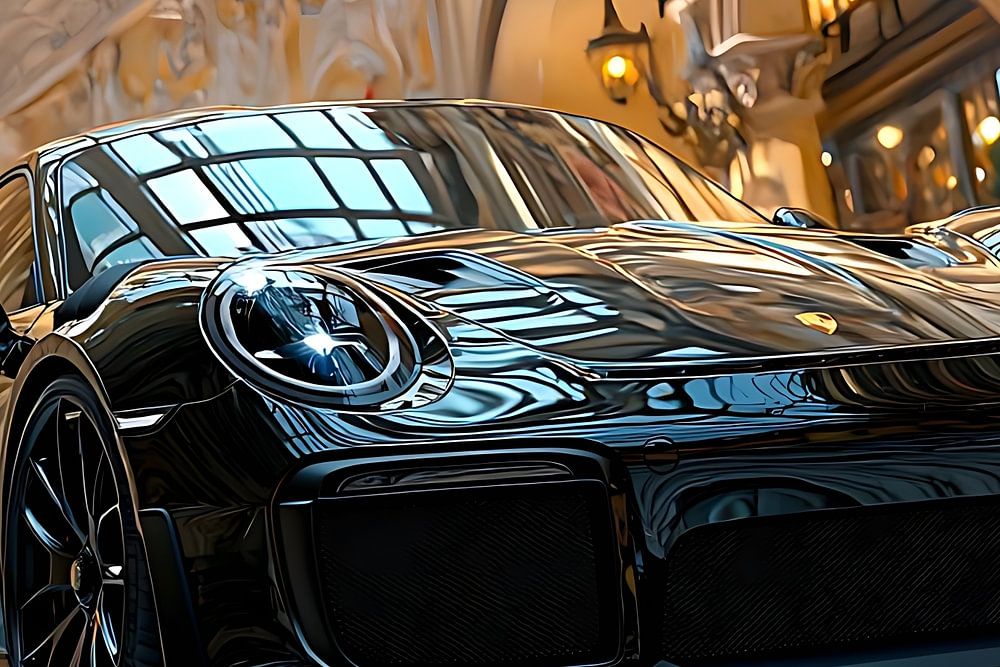 A black Porsche 911 GT3 exudes pure power and elegance. The deep black paint shines in the light, highlighting the sports car's flowing lines and aerodynamic shape. Its wide wheel arches and distinctive rear spoiler give the car an aggressive look, while the interior combines luxury and sportiness. With its roaring engine and sharp, precise steering, the black Porsche 911 GT3 is a perfect fusion of speed, style and performance, an icon on both the road and the track.