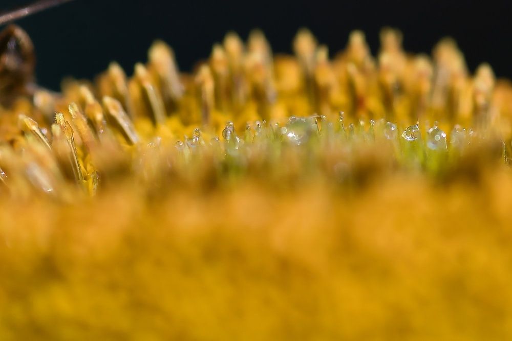 A macro photo of a yellow helianthus flower showing a blind bee searching for nectar.
