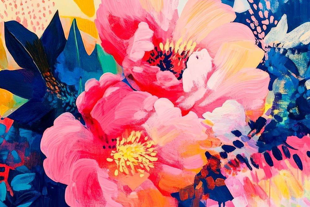 An explosion of colours and shapes come together in a harmonious dance. Radiant flowers in pink and soft blue radiate joie de vivre, while geometric patterns add a fresh dynamic. This work of art will liven up any living room and create a cheerful, inviting atmosphere that will enchant every guest. Ideal for a bright room full of inspiration!