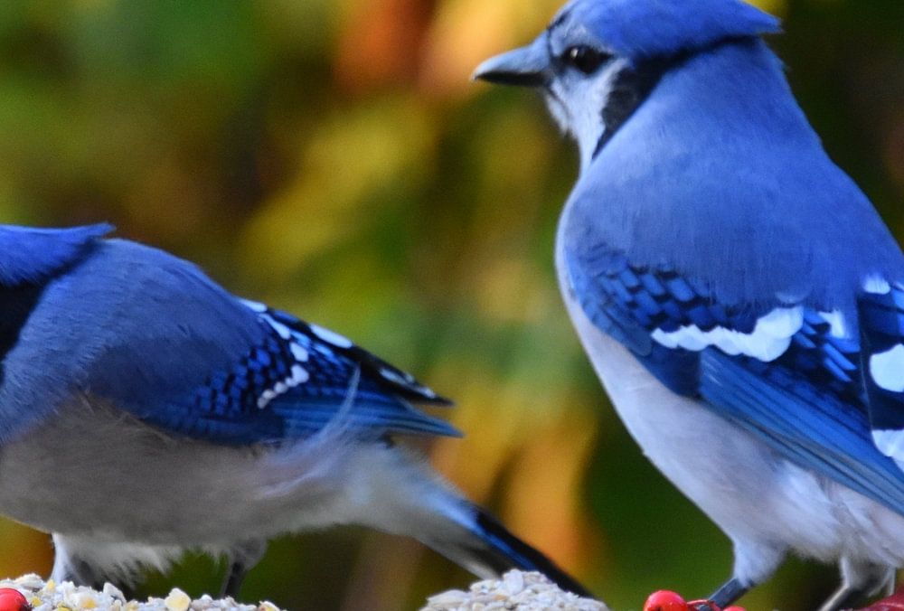 A blue jay at the feeding site in autumn, Sainte-Apolline, Quebec, Canada