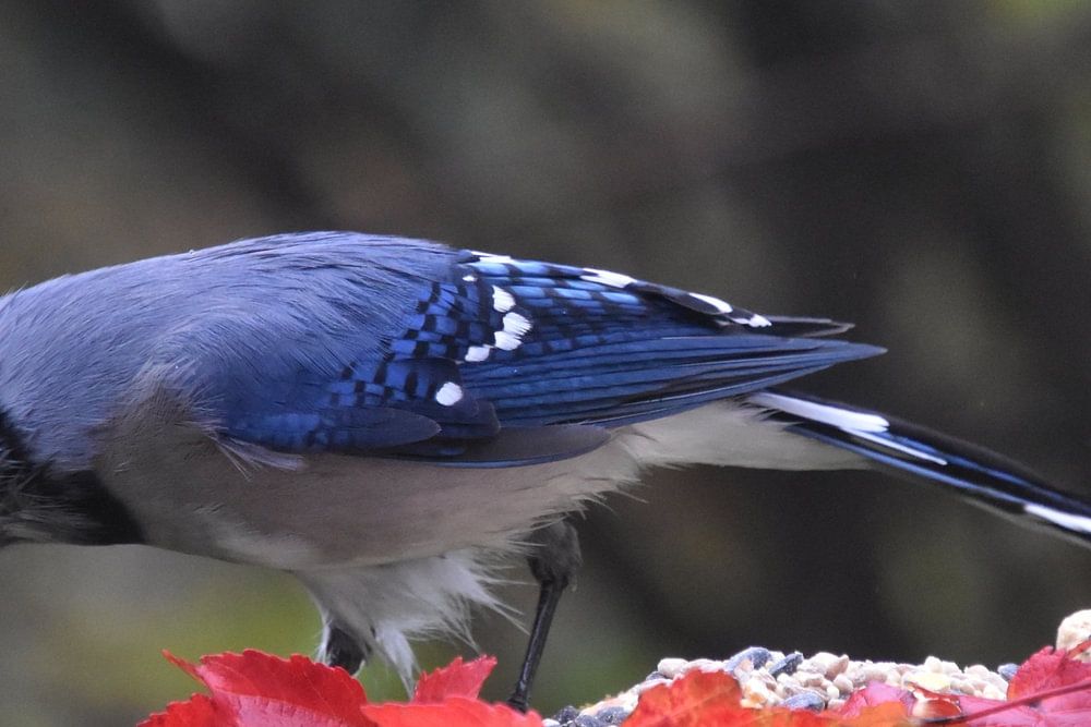 A blue jay at the garden feeder, Sainte-Apolline, Quebec, Canada
