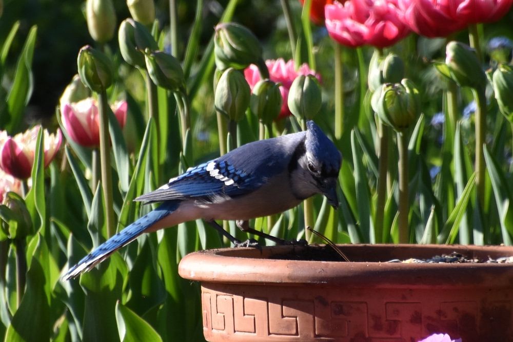 A blue jay in the garden in spring, Sainte-Apolline, Quebec, Canada