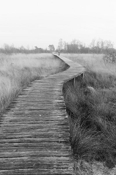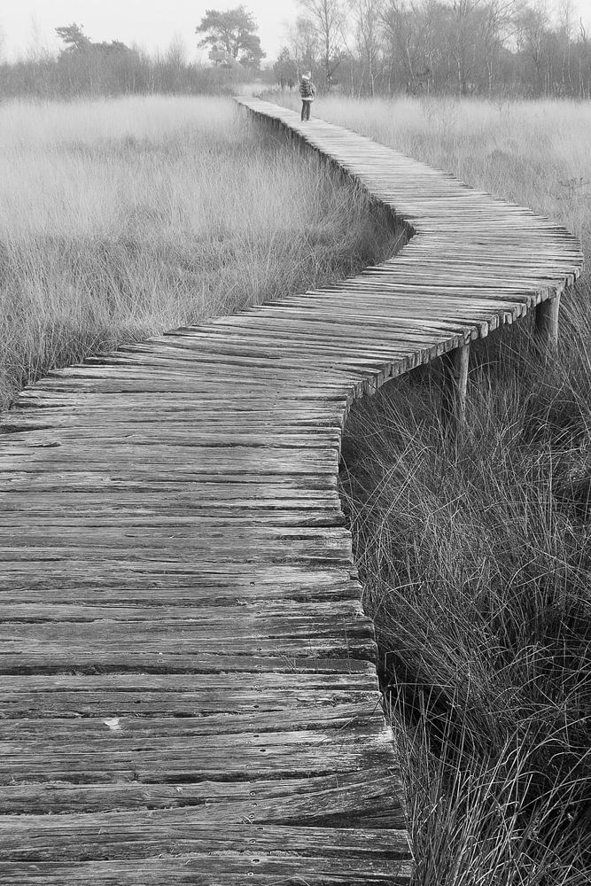 A winding ribbon of weathered wood cuts through the misty emptiness of De Peel. In this black-and-white composition, the boundaries between earth and sky blur, placing the focus entirely on the rhythm of the boardwalk. The path not only invites a stroll, but also compels the viewer to slow down. In the distance, we see a solitary…