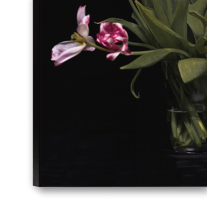 This still life shows an enchanting bouquet of tulips housed in a simple glass vase. The tulips have a wide range of colours, including white, pink, purple, red and yellow, giving the composition a vibrant and harmonious character. Some tulips are in full bloom, while others are still half-closed, creating a natural dynamic effect.