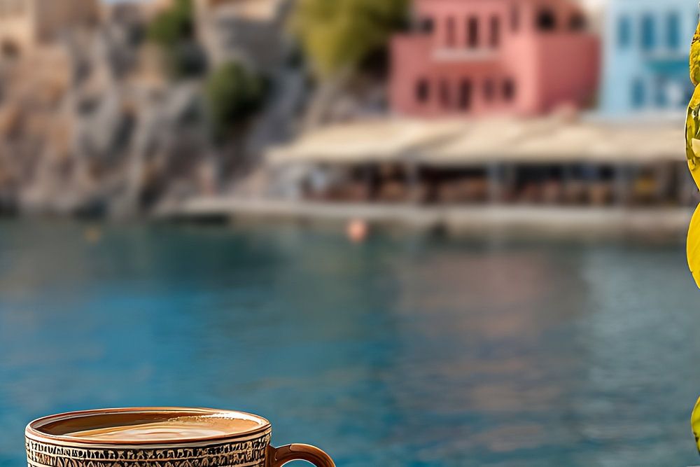 An artfully decorated coffee cup stands on a wooden railing with a view of the turquoise-coloured sea. In the background, colourful houses in pastel shades lie on a rocky coastline, while sunny yellow lemons hang from a branch in the foreground. The light is warm and clear, the scene has a Mediterranean feel - presumably on a calm morning on a Greek island.