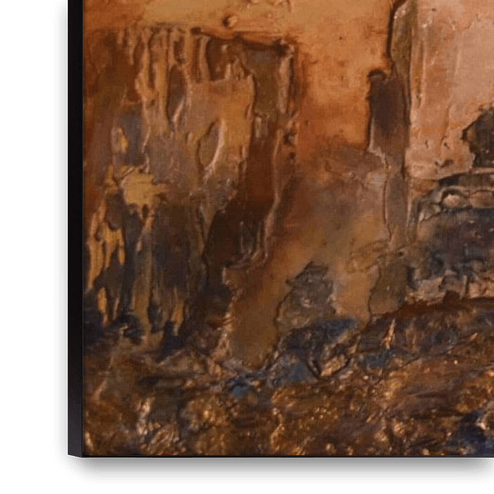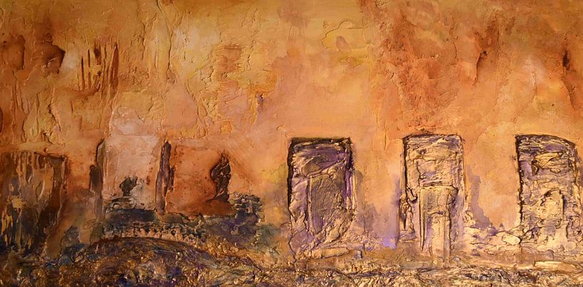 I wanted to paint a picture with an oriental feel. It depicts a city and three columns in a sandstorm. Thanks to its colour scheme, it looks great in rooms decorated in shades of gold, yellow, red or orange. It was created using modelling paste and acrylic paint.