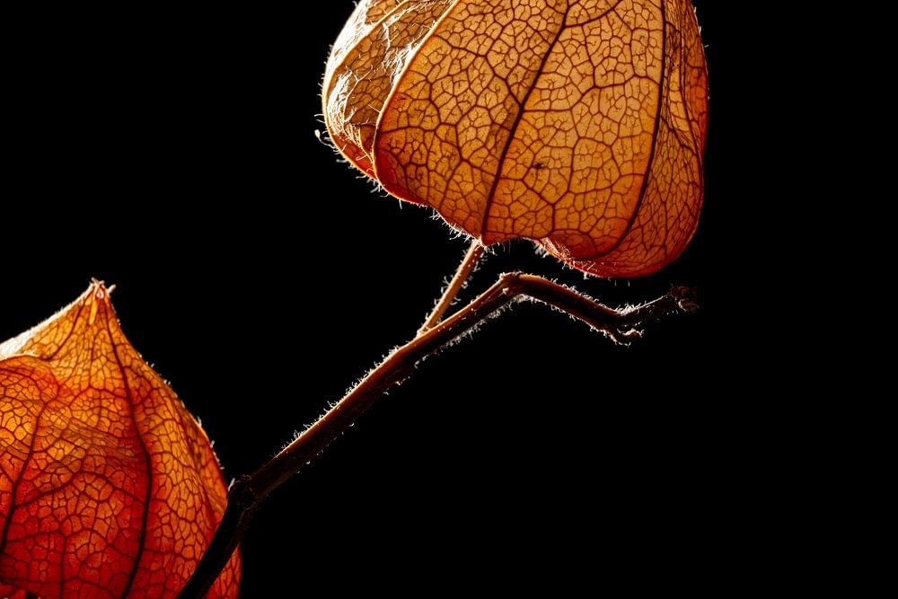 In the depths of the night, Physalis alkekengi, the lantern flower, comes to life. Against a deep black background, the orange envelope shines like a small, fiery lantern. It looks like a sparkling secret, a living beacon that carefully conceals its mystery.